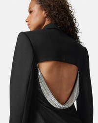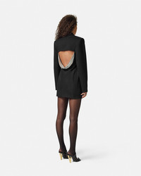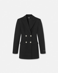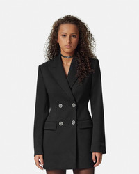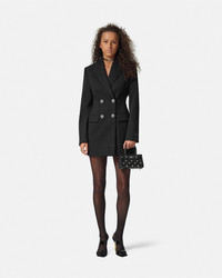 DETAILS A tailored blazer mini dress in stretch grain de poudre wool in an hourglass silhouette The doublebreasted style has sharp padded shoulders a jacquard Versace tailoring label on the sleeve and is accented by Medusa buttons The back has a low cutout and is embellished by a draped signature Atelier metal mesh insert - Medusa hardware - Tailoring label - Long sleeves - Peaked lapels - Front button closure - Front flap pockets - Outer composition: 98% Pure virgin wool, 2% Elastane - Lining: 74% Viscose, 26% Polyester - Trim: 100% Metal Item: 1018635-1A12258_1B000 SIZE & FIT - The model is 5'10" / 1.79 m tall and wears size 38 IT