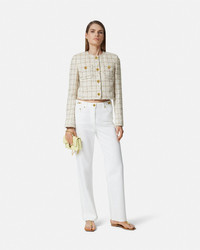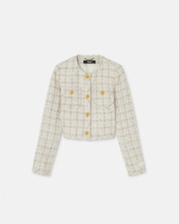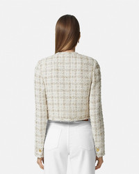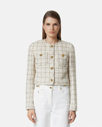 DETAILS This collarless cardigan jacket is crafted from a mixed tweed with lurex threading accent Medusa buttons and a tonal jacquard Versace tailoring label on the sleeve - Medusa hardware - Long sleeves - Round collar - Chest patch pockets - Buttoned cuffs - Outer composition: 54% Cotton, 20% Nylon, 14% Viscose, 6% Polyester, 4% Metallized Polyester, 2% Acrylic - Lining: 100% Cupro Item: 1018944-1A13646_2KN80 SIZE & FIT - The model is 5'10" / 1.79 m tall and wears size 38 IT