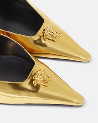 These slingback pumps in metallic laminated calf leather are set on a stiletto heel, featuring a pointed toe and the signature La Medusa hardware on the uppers. - La Medusa hardware - Adjustable ankle strap - Stiletto heel - Outer composition: 100% Calf leather - Lining 1: 100% Goat leather - Lining 2: 100% Lambskin - Sole: 100% Calf leather Size & Fit - The shoe weighs approximately 7.1 oz / 0.2 kg for the model size 39 IT - Footbed: regular - Fits true to size, take your normal size - Heel: 3.3" / 8.5 cm Item: 1020479-1A08609_1X00V