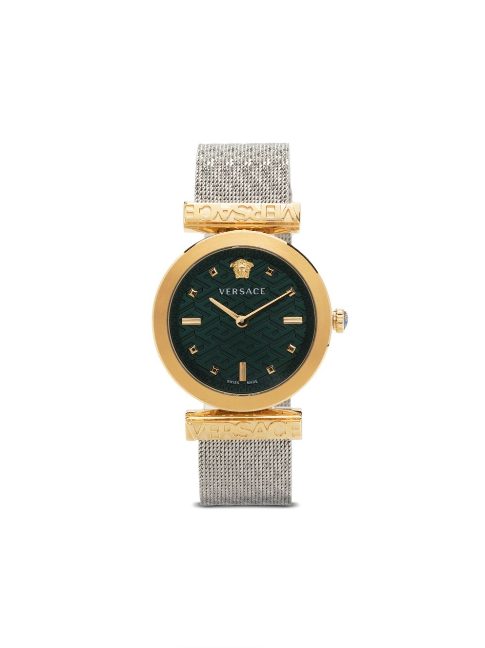 Regalia 34mm A display of Versace's opulence and distinctive identity, this refined timepiece is characterised by some of the brand's most iconic motifs. The eye-catching emerald-green dial is engraved with the La Greca pattern, while the Medusa Head stands proudly at the 12h mark. Highlights - Stainless steel - Quartz movement - Round face - Emerald green - Medusa plaque detail - Index hands - Sapphire-crystal glass - Silver-tone - Mesh bracelet - Slide-buckle fastening - Water resistance up to 30m/3 atm - This item comes with a standard two-year warranty from the brand. Imported SIZE & FIT Model measurements Height 5 ft 10 in(1.77 m) Bust/Chest 30.31 in(77 cm) Hips 33.85 in(86 cm) Waist 25.19 in(64 cm) Measurement CIRCUMFERENCE 5.23 in(13.3 cm) DIAMETER 2.36 in(6 cm) LENGTH 7.48 in(19 cm)