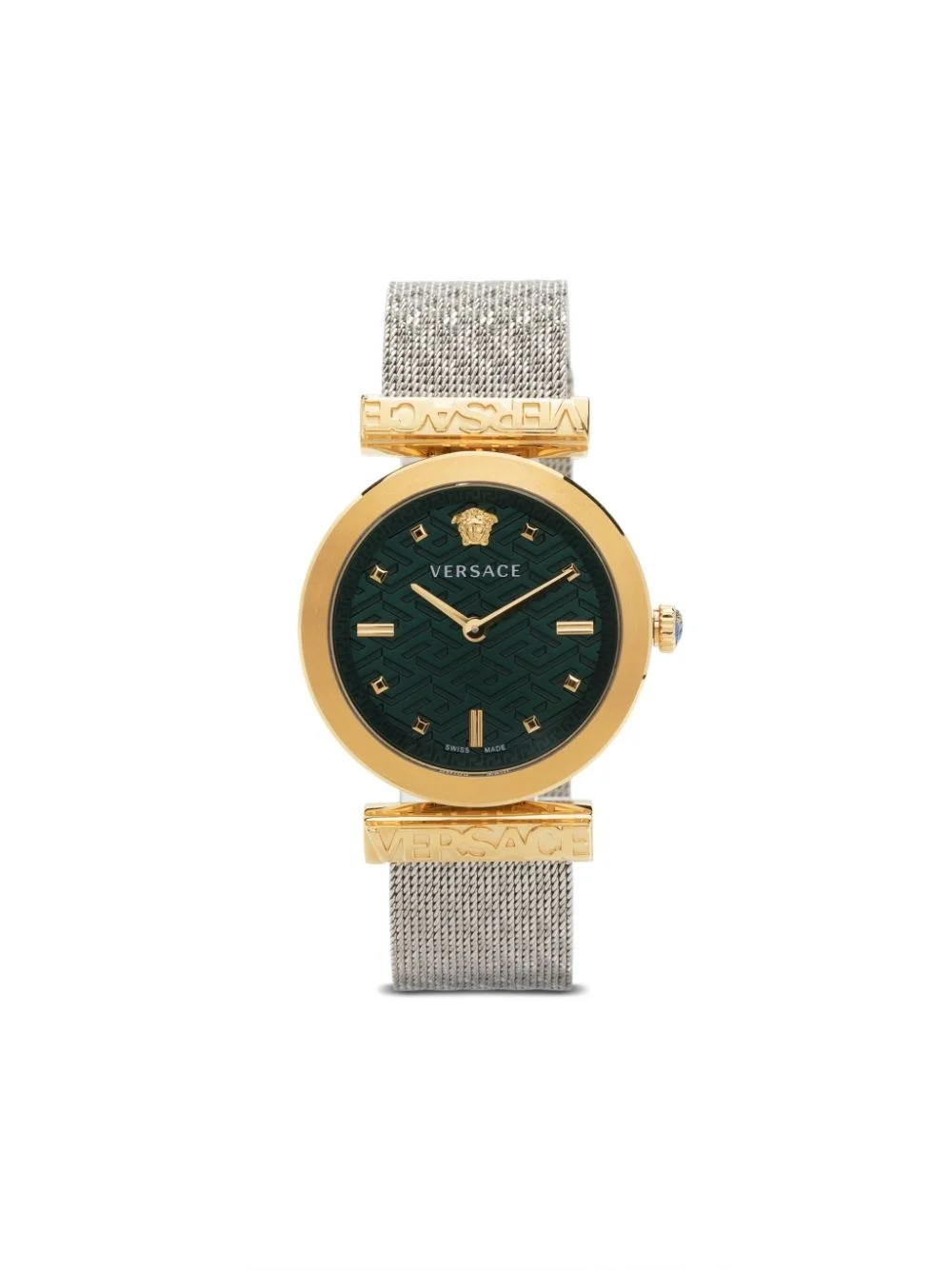 Regalia 34mm A display of Versace's opulence and distinctive identity, this refined timepiece is characterised by some of the brand's most iconic motifs. The eye-catching emerald-green dial is engraved with the La Greca pattern, while the Medusa Head stands proudly at the 12h mark. Highlights - Stainless steel - Quartz movement - Round face - Emerald green - Medusa plaque detail - Index hands - Sapphire-crystal glass - Silver-tone - Mesh bracelet - Slide-buckle fastening - Water resistance up to 30m/3 atm - This item comes with a standard two-year warranty from the brand. Imported SIZE & FIT Measurement CIRCUMFERENCE 5.23 in(13.3 cm) DIAMETER 2.36 in(6 cm) LENGTH 7.48 in(19 cm)