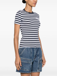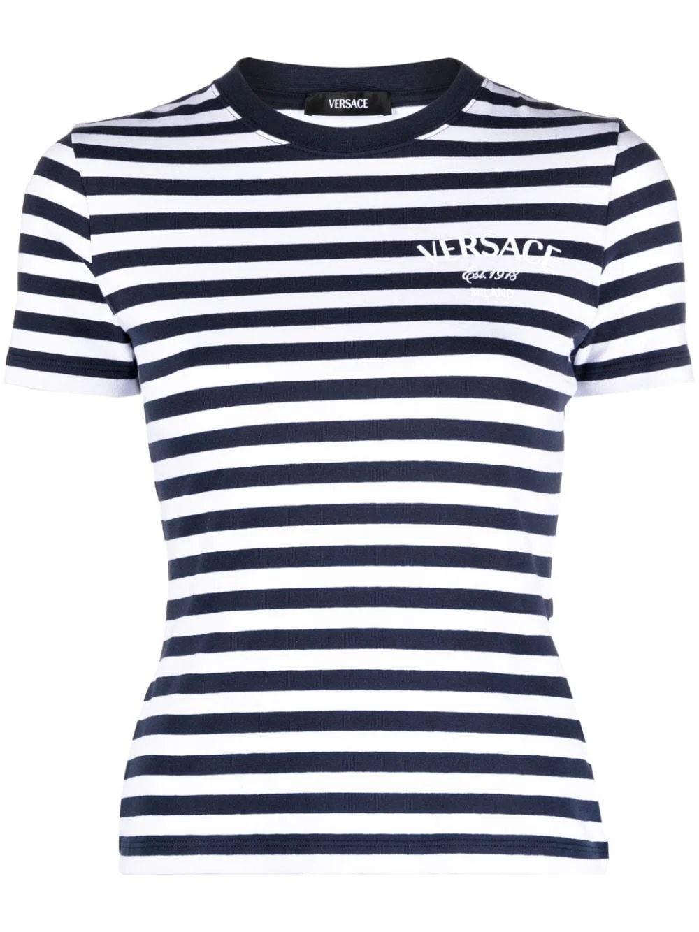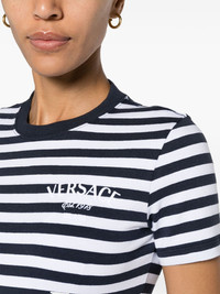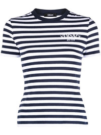 logo-embroidered striped T-shirt The nautical stripes of this Versace T-shirt are complemented by a coordinating maritime print at the back. The Milano Stamp embroidery at the chest spells out the brand’s founding year and location. Highlights - White - Navy blue - Stretch-cotton - Technical jersey - Horizontal stripe pattern - Embroidered logo at the chest - Graphic print to the rear - Crew neck - Short sleeves - Straight hem Imported Composition Polyester 100%, Cotton 94%, Spandex/Elastane 6% SIZE & FIT Model measurements Height 5 ft 10 in(1.78 m) Bust/Chest 33.07 in(84 cm) Hips 36.61 in(93 cm) Waist 24.8 in(63 cm) FittingInformation Designed for a close fit throughout Made from a midweight stretch fabric, this piece offers elasticity and flexibility when worn This piece fits true to size – take your usual size Washing instructions Machine Wash