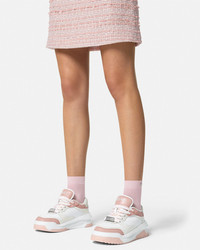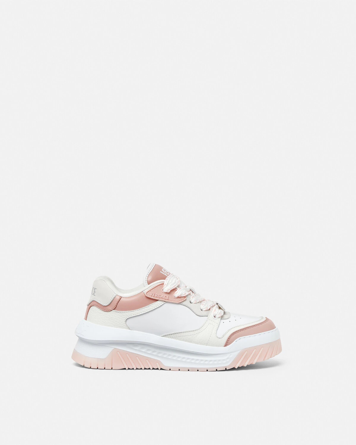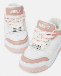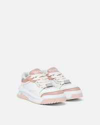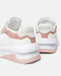 DETAILS Modern, lightweight sneakers, set on rubber soles with perforated toe caps, featuring an enamel Greca tag on the laces. A Versace logo embroidery details the tongue. - Greca motif - Versace logo on tongue and heel counter - Low top - Lace up - Perforated toe caps - Rubber soles - Outer composition: 100% Calf leather - Lining 1: 100% Nylon - Lining 2: 100% Calf leather - Trim: 100% Calf leather - Sole: 100% Rubber Item: 1016365-1A10925_2PU1P SIZE & FIT - The shoe weighs approximately 14 oz / 0.4 kg for the model size 37 IT - Fits true to size, take your normal size