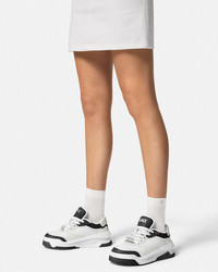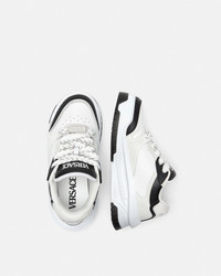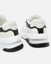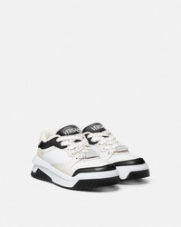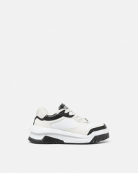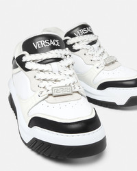 DETAILS Modern, lightweight sneakers, set on rubber soles with perforated toe caps, featuring an enamel Greca tag on the laces. A Versace logo embroidery details the tongue. - Greca motif - Versace logo on tongue and heel counter - Low top - Lace up - Perforated toe caps - Rubber soles - Outer composition: 100% Calf leather - Lining 1: 100% Nylon - Lining 2: 100% Calf leather - Trim: 100% Calf leather - Sole: 100% Rubber Item: 1016365-1A10925_2B02P SIZE & FIT - The shoe weighs approximately 14 oz / 0.4 kg for the model size 37 IT - Fits true to size, take your normal size