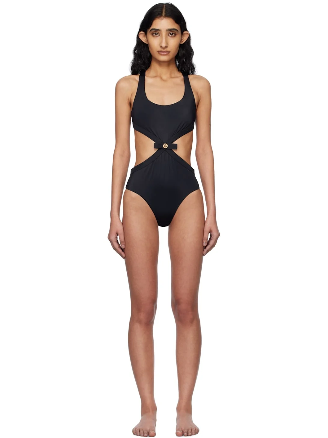 Stretch nylon jersey one-piece swimsuit. · Scoop neck · Bow applique and Medusa hardware at waist · Cutout at sides and back · Partially lined Supplier color: Black Body: 78% polyamide, 22% elastane. Lining: 88% polyester, 12% elastane. Made in Italy 251653F103006