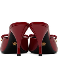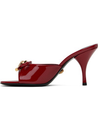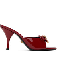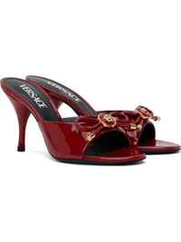 Patent calfskin heeled sandals in red. · Open toe · Bow accent and Medusa hardware at vamp · Logo printed at padded goatskin footbed · Buffed lambskin lining · Covered stiletto heel with rubber injection · Medusa hardware at polished calfskin sole · Heel: H3.5" Supplier color: Red Upper: calfskin. Sole: calfskin, rubber. Made in Italy 251404F125005