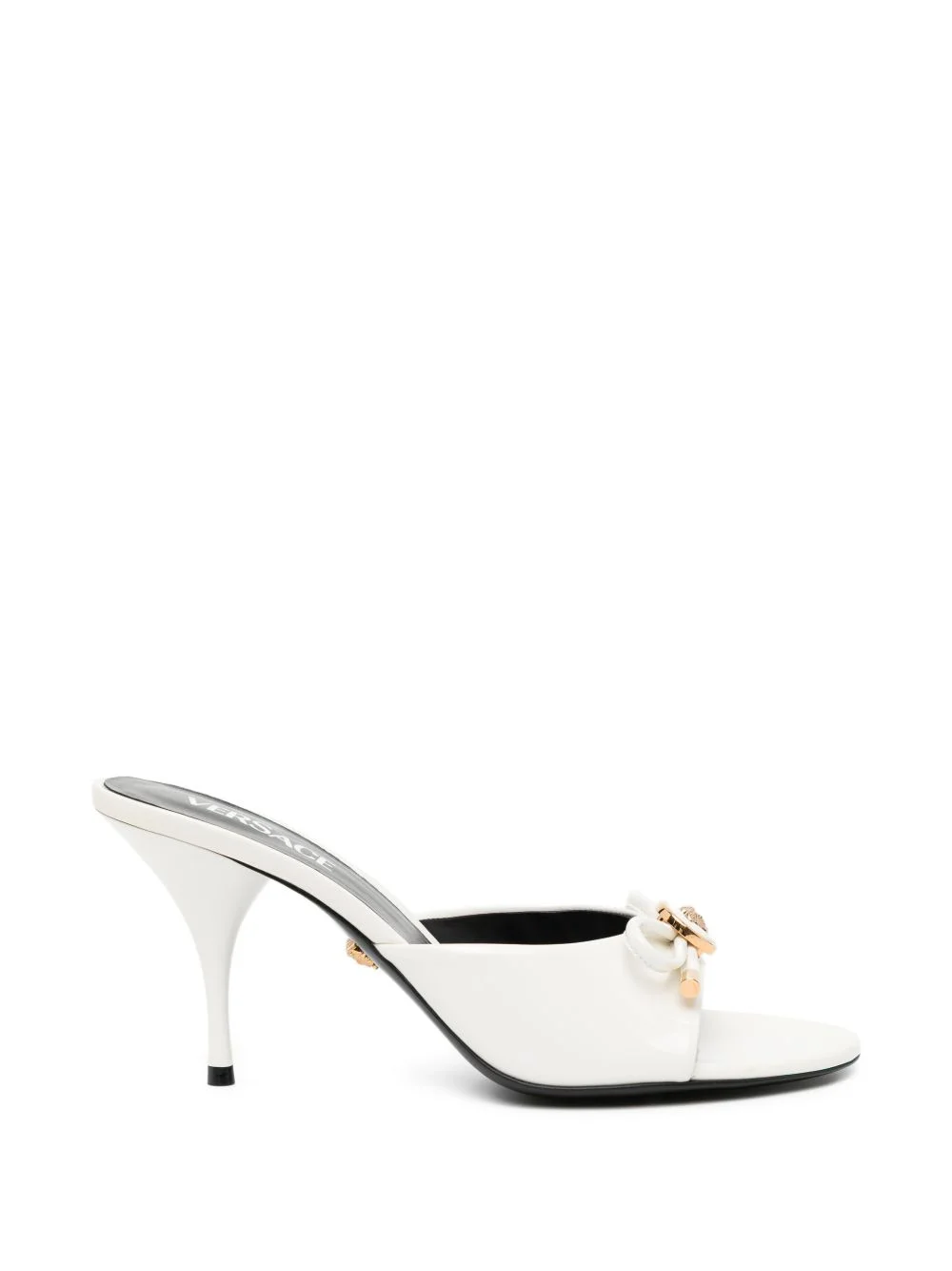 85mm flower detail sandals Highlights - Porcelain white - Flower detail - Gold-tone hardware - Stiletto heel - Square toe - Slip-on style Made in Italy Composition Lining: Calf Leather 100% Outer: Calf Leather 100% Sole: Calf Leather 100% SIZE & FIT Measurement HEEL 3.34 in(8.5 cm)