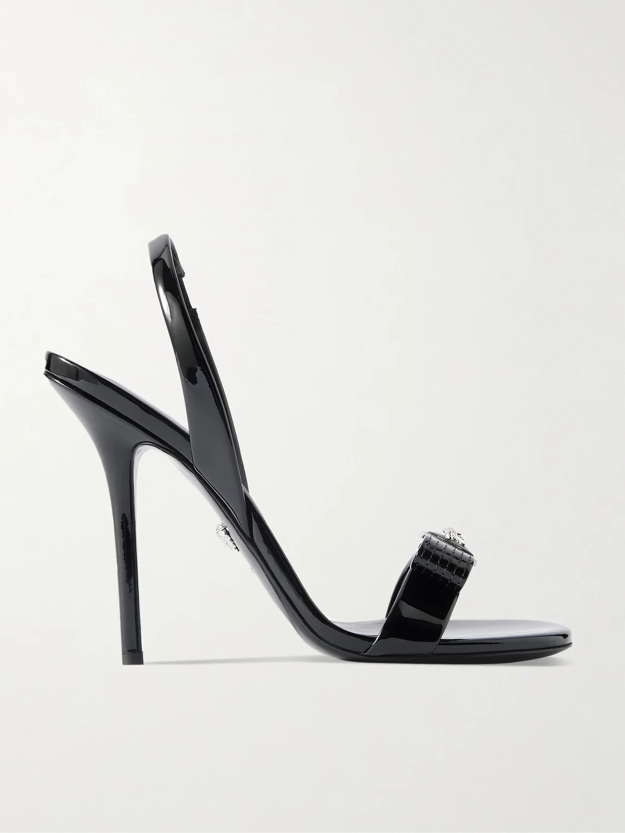 Versace's slingback sandals are inspired by the glamour and sophistication of the opera. They've been made in Italy from glossy patent-leather and have topstitched bows featuring the signature 'Medusa' emblem in silver-tone metal. The slim heels offer 110mm of lift.