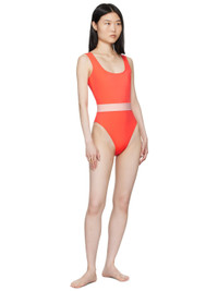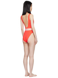 Stretch nylon jersey one-piece swimsuit. · Square neck · Elasticized jacquard logo trim at waist · Fixed shoulder straps · Low back · Partially lined Supplier color: Coral Body: 78% polyamide, 22% elastane. Trim: 82% polyester, 9% polyamide, 9% elastane. Lining: 78% polyamide, 22% elastane. Made in Italy 242653F103017