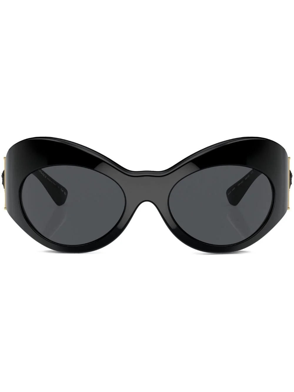 cat-eye frame sunglasses Showcasing a maximalist aesthetic, these Versace Eyewear sunglasses make a bold statement with their oversized cat-eye frame. Crafted in Italy, they feature sculpted arms that display the house's signature Medusa Head motif. Highlights - Black - Acetate - Gold-tone hardware - Cat-eye frame - Grey tinted lenses - Signature greca detailing - Medusa plaque detail - Sculpted arms - Curved tips - These glasses come with a protective case. Made in Italy Composition Acetate 100% SIZE & FIT Measurement Arm Length 4.52 in(11.5 cm) Bridge Width 0.78 in(2 cm) Lens Diameter 2.28 in(5.8 cm)