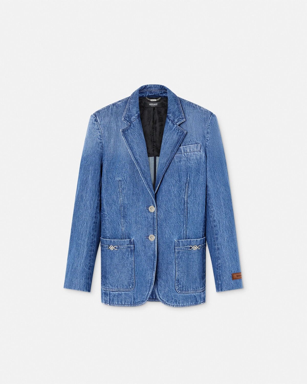 DETAILS A single-breasted stonewashed denim jacket with accent Medusa '95 hardware on the front pockets, complete with structured, padded shoulders, and a jacquard Barocco lining. A leather Versace logo patch details the sleeve. - Medusa '95 hardware - Versace logo leather patch - Barocco lining - Long sleeves - Notched collar - Front button closure - Chest welt pocket - Front patch pockets - Back vent - Outer composition: 100% Cotton - Lining: 58% Cupro, 42% Viscose - Trim: 100% Calf leather Item: 1016272-1A07079_1D030 SIZE & FIT - The model is 5'10" tall and wears size 38 IT
