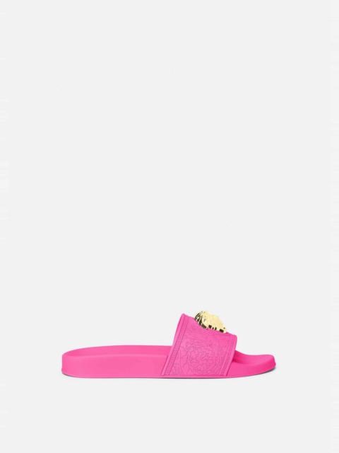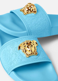 Rubber pool slides embellished with a three-dimensional Medusa plaque surrounded by a Greca accent. DETAILS & CARE - Three-dimensional Medusa - Greca - Outer fabric: 100% Polyurethane - Sole: 100% Polyurethane - Made in Italy SIZE & FIT - Height: 0,5 - All sizes fit Italian standards - Fits true to size, take your normal size