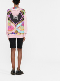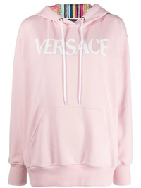 panelled print hooded sweatshirt panelled print hooded sweatshirt from VERSACE featuring rose pink, cotton blend, drawstring hood, logo print at the chest, front pouch pocket, ribbed-knit edge, contrasting panel detail and long sleeves. Made in Italy Composition Outer: Polyester 100%, Cotton 100% Lining: Polyester 100% SIZE & FIT Model measurements Height 5 ft 10 in(1.77 m) Bust/Chest 31.49 in(80 cm) Hips 33.85 in(86 cm) Waist 22.44 in(57 cm) FittingInformation This piece fits true to size. We recommend you get your regular size Cut for a loose fit Made with a mid-weight fabric Washing instructions Machine Wash