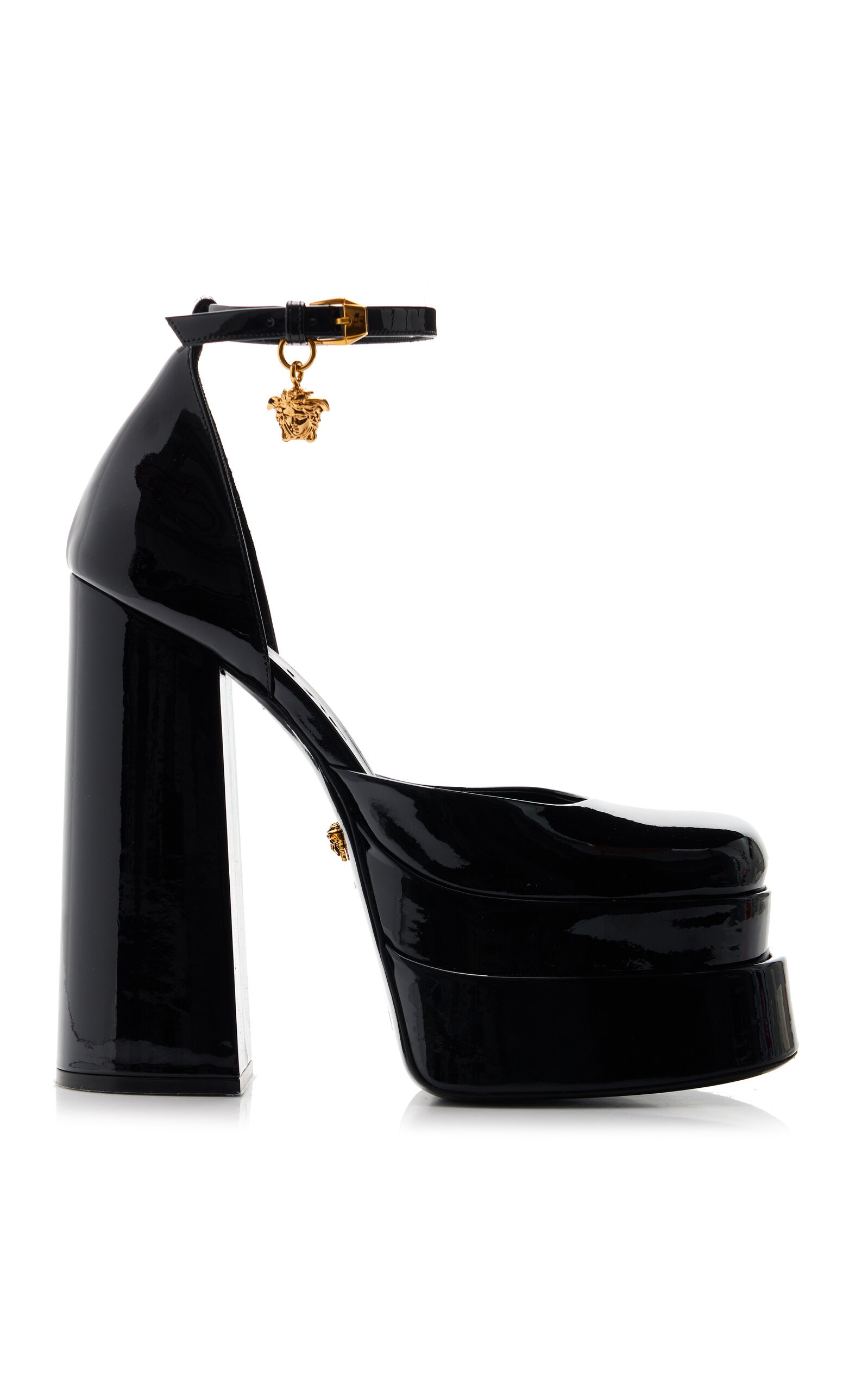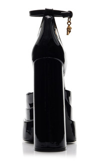 Sitting on a double three-inch platform, Versace's sky-high pumps have garnered a cult following among fashion insiders everywhere. This iteration has been crafted in Italy from glossy patent leather with a crystal-encrusted ankle strap and thick block heel that makes them surprisingly easy to walk in. Pair your jewels to the Medusa charm. PRODUCT DETAILS - Heel height measures approximately 155mm/ 6.1" - Buckle fastening - Composition: 72% viscose, 28% silk; Lining: 100% goatskin leather; Sole: 100% calfskin leather; crystals - Made in Italy