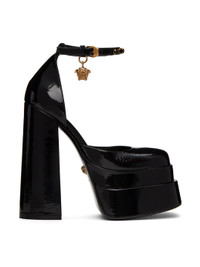 Patent calfskin heels in black. Medusa charm and crystal-cut accents at adjustable pin-buckle ankle strap. · Square toe · Logo-embossed goatskin footbed · Covered block heel with rubber injection · Covered platform midsole · Medusa hardware at polished calfskin outsole · Platform: H2.5 in · Heel: H6.25 in Supplier color: True purple Upper: calfskin, goatskin. Sole: calfskin, rubber. Made in Italy 222404F122060