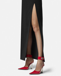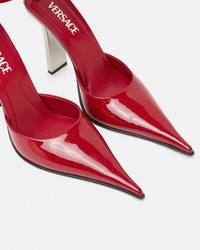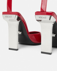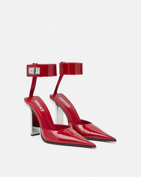 DETAILS These patent leather slingback pumps feature sharp pointed toes and slim square heels in a galvanised finish The ankle strap has a metal Versace Milano lock closure inspired by the archival 90s Vintage Logo and features an engraved checkered pattern - Versace Milano lock hardware - Slip-on - Slingback strap - Pointed toe - Slim block heel - Outer composition: 100% Calf leather - Lining: 100% Lambskin - Sole: 100% Calf leather Item: 1016741-D2VE_1RB3P SIZE & FIT - The shoe weighs approximately 10.5 oz / 0.3 kg for the model size 38 IT - Heel: 4.1" / 10.5 cm - Footbed: slim - Fit is true to size, we recommend taking your normal size