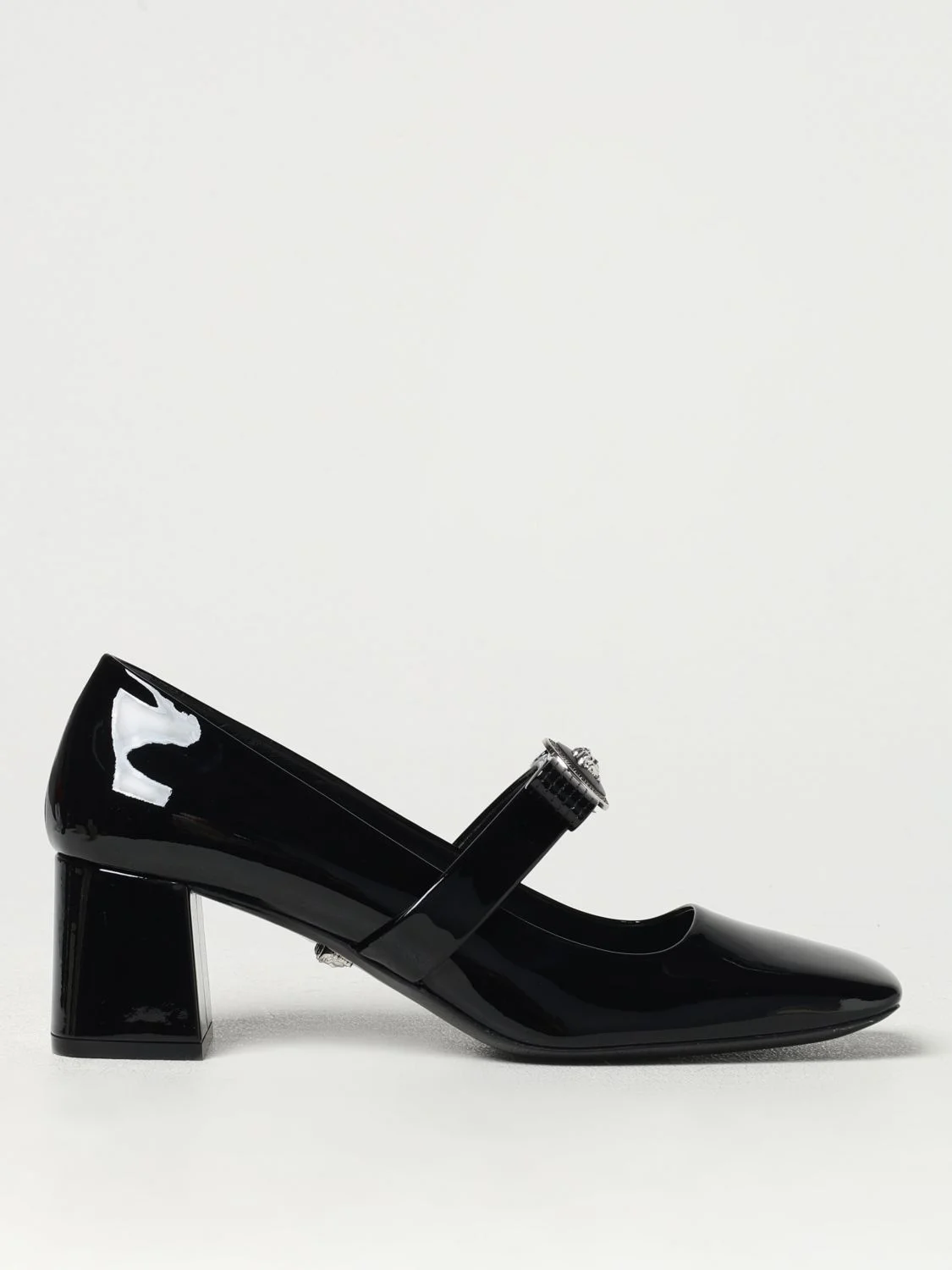 DESCRIPTION - Logo: Versace Medusa - Details: With bow - Lining: Leather, With printed logo - Model: Slip on - Toe: Squared - Sole: Leather - Heel: Medium - Materials: Patent leather - Pattern: Plain-colored DETAILS AND CARE Composition 100% VL SIZE AND FIT Sizes Heel: 6,5 cm Designer code: 1016203D2VE 1B00P Giglio Code: 411952 Designer: Versace Collection: Versace Woman Category: Shoes Versace