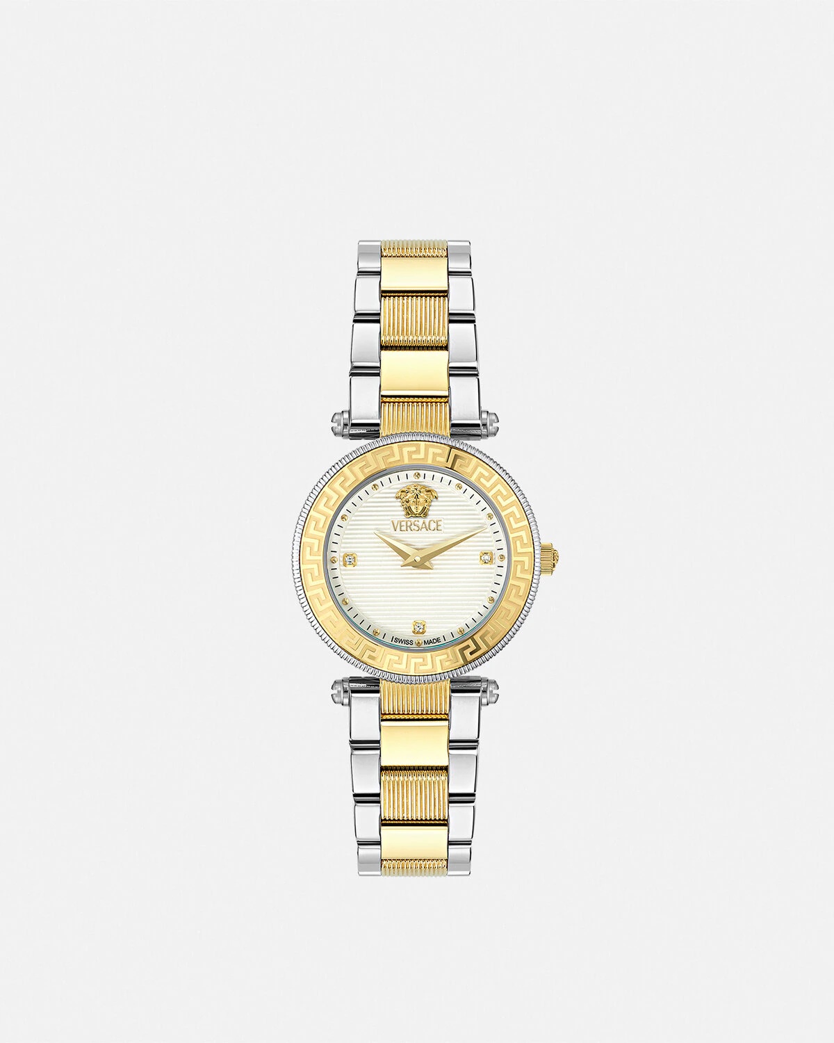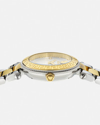DETAILS Item: - Case: Bicolor (SS&IP2N) case with tonal Greca on the top ring - Dial: White silver guilloche dial with Medusa and Versace logo at 12h / 3 diamonds on indexes - Bracelet: Bicolor (SS&IP2N) bracelet with butterfly buckle - Movement: RONDA 762 Swiss Quartz 2-hands movement - Water Resistant: 3 ATM Item: PVEBFA02-P0024_RTU_TU_PNUL__ SIZE & FIT - Case: 1.2" / 30 mm