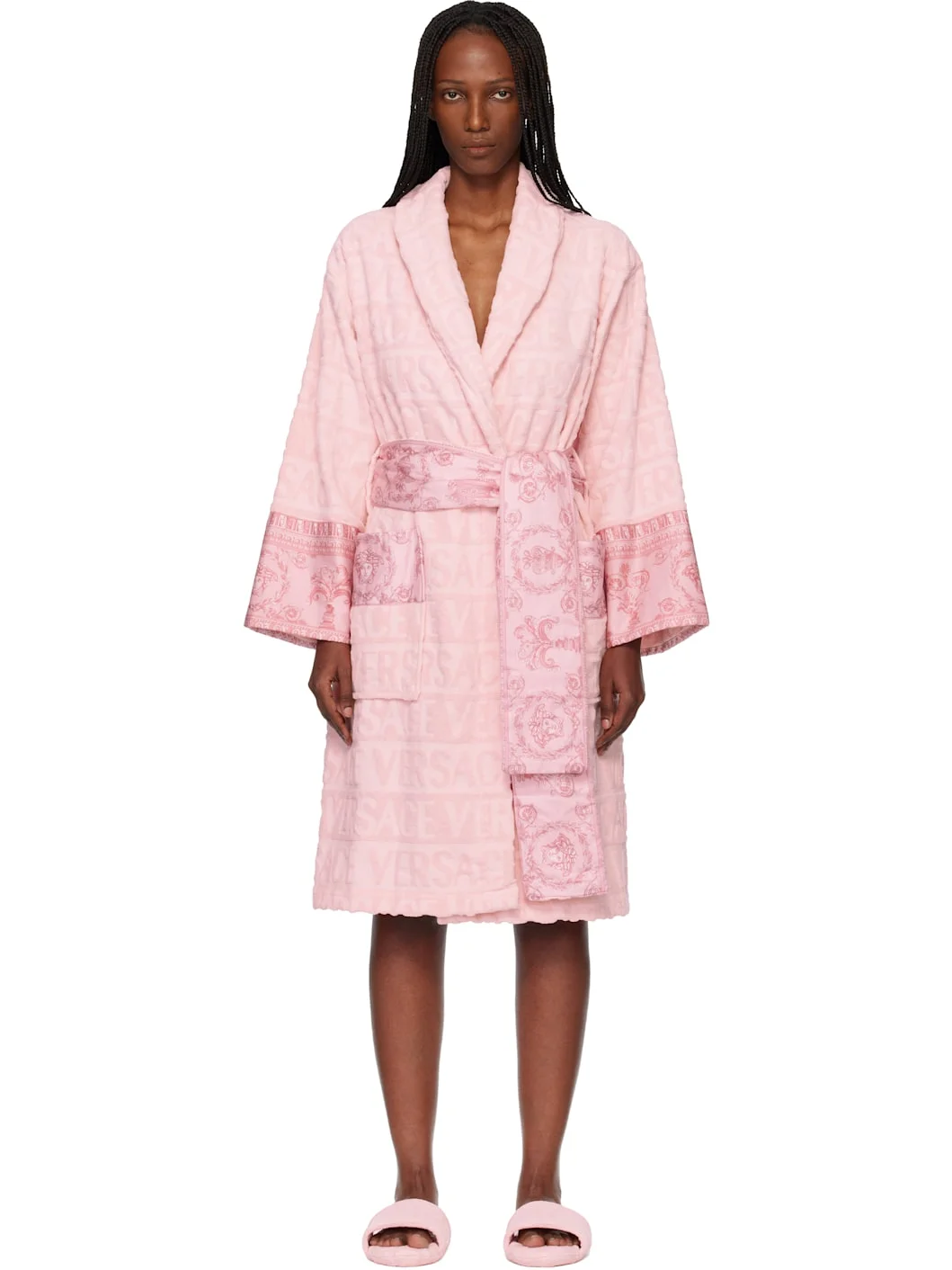Cotton terrycloth bathrobe. · Jacquard logo pattern and Barocco poplin trim throughout · Shawl collar · Belt loops with detachable self-tie belt · Patch pockets at waist · Dropped shoulders Supplier color: Pink 100% cotton. Made in Italy 261404F077017