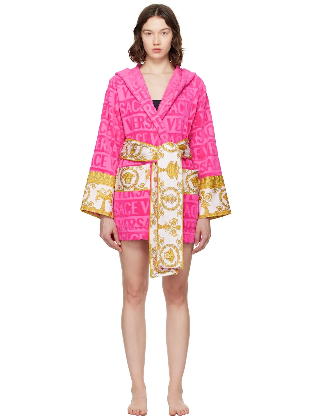 Cotton terrycloth bathrobe. Jacquard logo pattern and Barocco-patterned poplin trim throughout. · Shawl collar · Belt loops with detachable self-tie belt · Patch pockets at waist Supplier color: Pink 100% cotton. Made in Italy 252404F077010