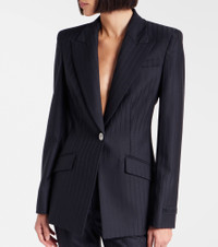 Inspired by Greek mythology, the Medusa head has become the ultimate signifier of the house of Versace. This pinstriped blazer is crafted from a wool blend and is finished with buttons boasting the iconic motif. Product Details - Material: 100% virgin wool - Care instructions: dry clean - Made in Italy - Designer color name: Black - Item color: black - Lining: 100% cupro - Hardware color: silver - Peak lapel - Cuff: three buttons - Pockets: breast pocket, flap pockets - Closure: single-breasted (one button) - Vent: single - Shoulder pads - Item number: P01080576 Size & Fit - True to size - Shoulder pad inserts - Cinched waist - Non-stretchy fabric - Falls below the hip - The model seen in the picture is 178cm-5'10" and wearing a size IT 40