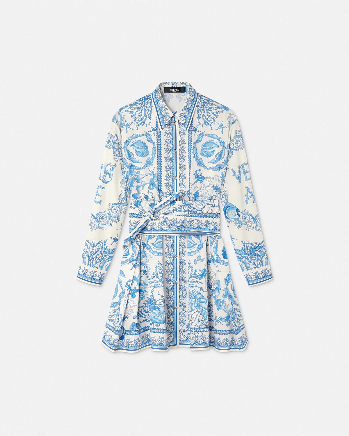 DETAILS A longsleeved mini shirt dress in cotton poplin featuring a fit and flare silhouette with side pleats and an Underwater Barocco foulard print with seashell coral and starfish motifs The belted style is accented by signature Medusa buttons - Underwater Barocco print - Medusa hardware - Long sleeves - Pointed collar - Front button closure - Buttoned cuffs - Detachable waist belt - Outer composition: 100% Cotton Item: 1020824-1A15278_5K650 SIZE & FIT - The model is 5'11" / 1.80 m tall and wears size 38 IT