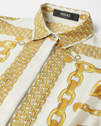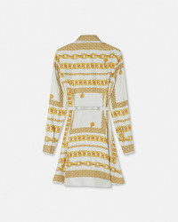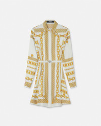 DETAILS This longsleeved midi shirt dress with a flared skirt is crafted from silk twill and features the Versace Treasure print with chain motifs A detachable Medusa 95 belt accents the waist - Versace Treasure print - Medusa '95 hardware - Long sleeves - Pointed collar - Concealed front button placket - Buttoned cuffs - Outer composition: 100% Silk - Trim: 100% Silk Item: 1018933-1A13638_5E490 SIZE & FIT - The model is 5'10" / 1.79 m tall and wears size 38 IT