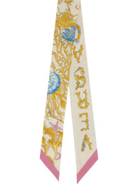 Silk twill skinny scarf. · Logo graphic pattern printed throughout · Logo printed at end · L34" x W2" Supplier color: Multicolor/Gold 100% silk. Made in Italy 252404F029002