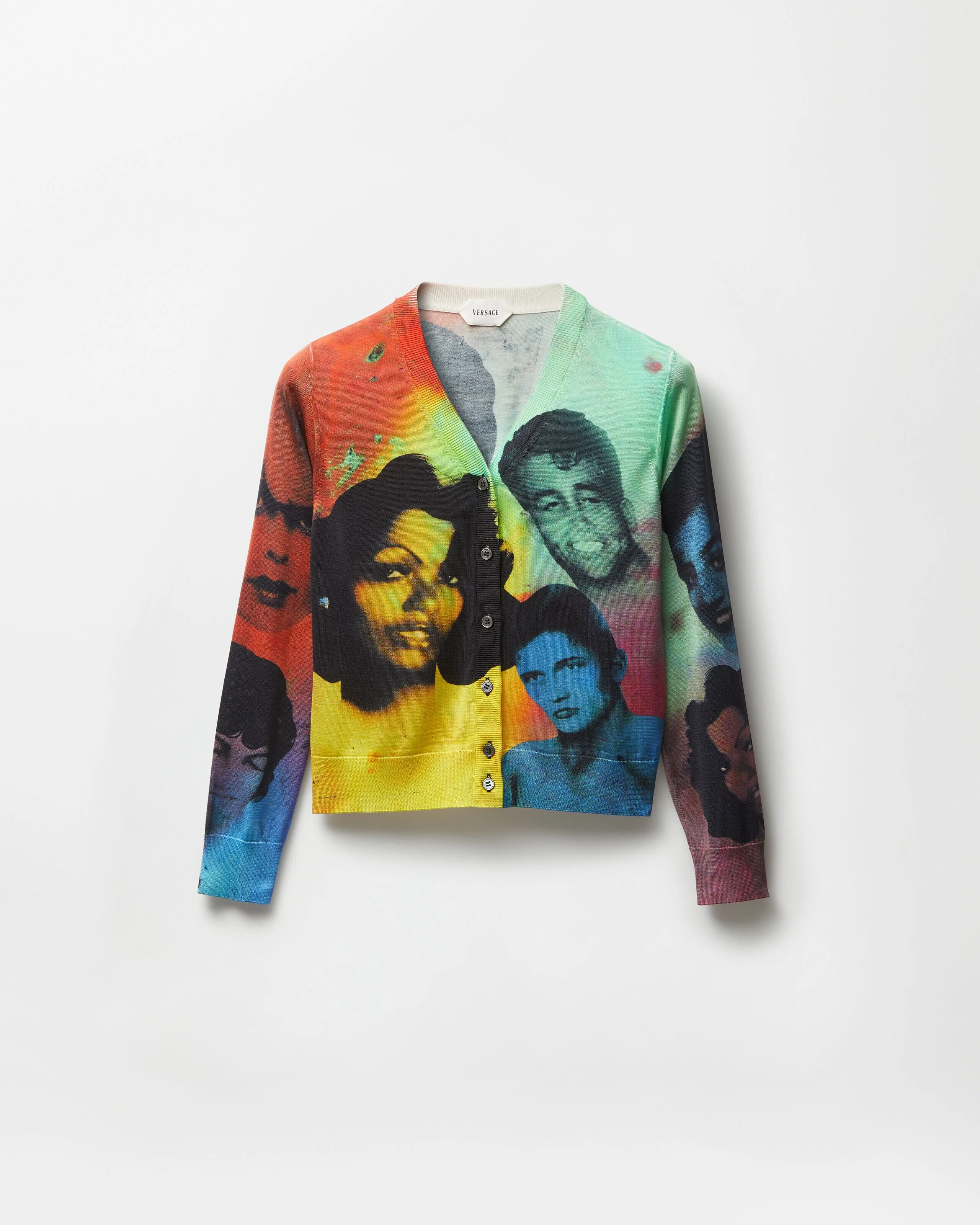 This long-sleeved V-neck cardigan is knit from silk featuring "The Party" print—using hyper saturation and primary colors to render anonymous faces. - 'The Party' print - Long sleeves - V-neckline - Front button closure - Ribbed trims - Outer composition: 100% Silk Size & Fit - The model is 5'10" / 1.77 m tall and wears size 36 IT Item: 1024236-1A17778_5X000