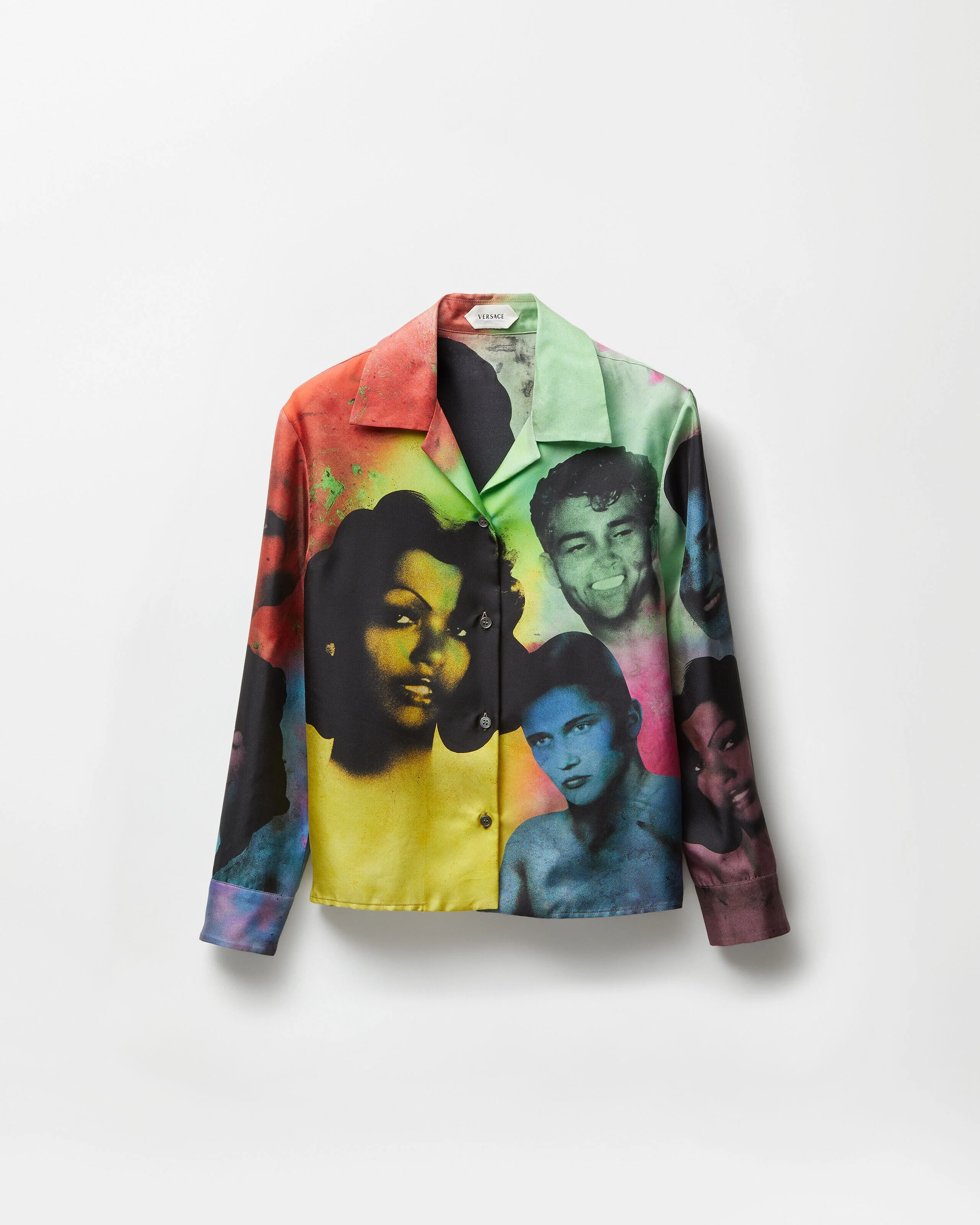 A long-sleeved slim-fit shirt in silk twill featuring 'The Party' print—using hyper saturation and primary colors to render anonymous faces—detailed by a jacquard Versace Logo label at the back collar. - 'The Party' print - Versace Logo label - Long sleeves - Notched collar - Front button closure - Buttoned cuffs - Outer composition: 100% Silk Size & Fit - The model is 5'10" / 1.77 m tall and wears size 38 IT Item: 1024231-1A17913_5X000