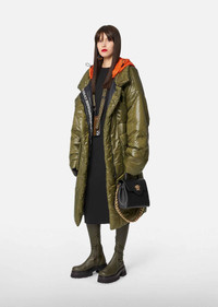 A statement design, this voluminous puffer coat features a bold, yet feminine silhouette. The sculptural design is refreshed with a contrast color hood and a graphic Greca pattern along the zip fastening. DETAILS & CARE - Hood - Belted - Front zip fastening - Greca tape along internal zip fastening - Outer fabric: 100% Nylon - Lining 1: 100% Polyester - Lining 2: 100% Nylon - Padding: 100% Polyester - Do not wash - Do not bleach - Do not tumble dry - Cool iron - Delicate dry clean - Protect accessory before washing SIZE & FIT - Oversized fit - All sizes fit Italian standards - The model is 1,79 cm tall and wears a size 38