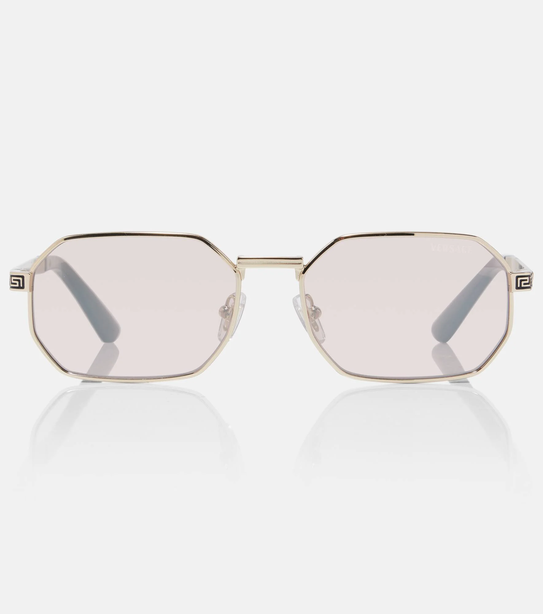 Look forward with these sunglasses from Versace. Crafted with gold-toned frames, the rectangular pair boasts vibrant pink lenses. Product Details - Frame material: metal - Frame color: gold - Lens filter category 2 - Color: gold - Lens color: pink - Made in Italy - Includes: case and presentation box, cleaning cloth - The color of the case may vary - Item number: P01167937 Size & Fit - Lens width: 53mm-2.1" - Bridge size: 15mm-0.6" - Earpiece length: 144mm-5.65"