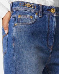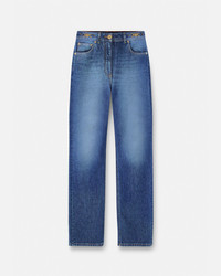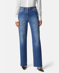 DETAILS Stone-washed straight regular jeans detailed with a Medusa '95 emblem at the pocket. - Medusa '95 hardware - Belt loops - Five-pocket design - Back leather logo patch - Outer composition: 100% Cotton - Lining: 65% Polyester, 35% Cotton - Trim: 100% Calf leather Item: 1011519-1A07079_1D100 SIZE & FIT - The model is 5'10" tall and wears size 27 IT