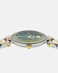 DETAILS A refined timepiece with a strong personality, characterised by the rendition of the iconic matelassé effect on dial, enamel Greca frame and a Medusa accent on the metal loop. The dial is enriched with a three-dimensional Medusa and the Versace logo at 12 o'clock. The accessory is complete with a metal bracelet with textured links and butterfly buckle. All Versace watches are guaranteed by the 'Swiss Made' marking. - Case: Bicolor (SS&IP2N) case with green top ring - Dial: IP2N guillochè dial with Medusa and Versace logo at 12h - Bracelet: Bicolor (SS&IP2N) bracelet with butterfly buckle - Movement: RONDA 762 Swiss Quartz 2-hands movement - Water Resistant: 5 ATM Item: PVE8B005-P0024_RTU_TU_PNUL__ SIZE & FIT - Case: 1.4"
