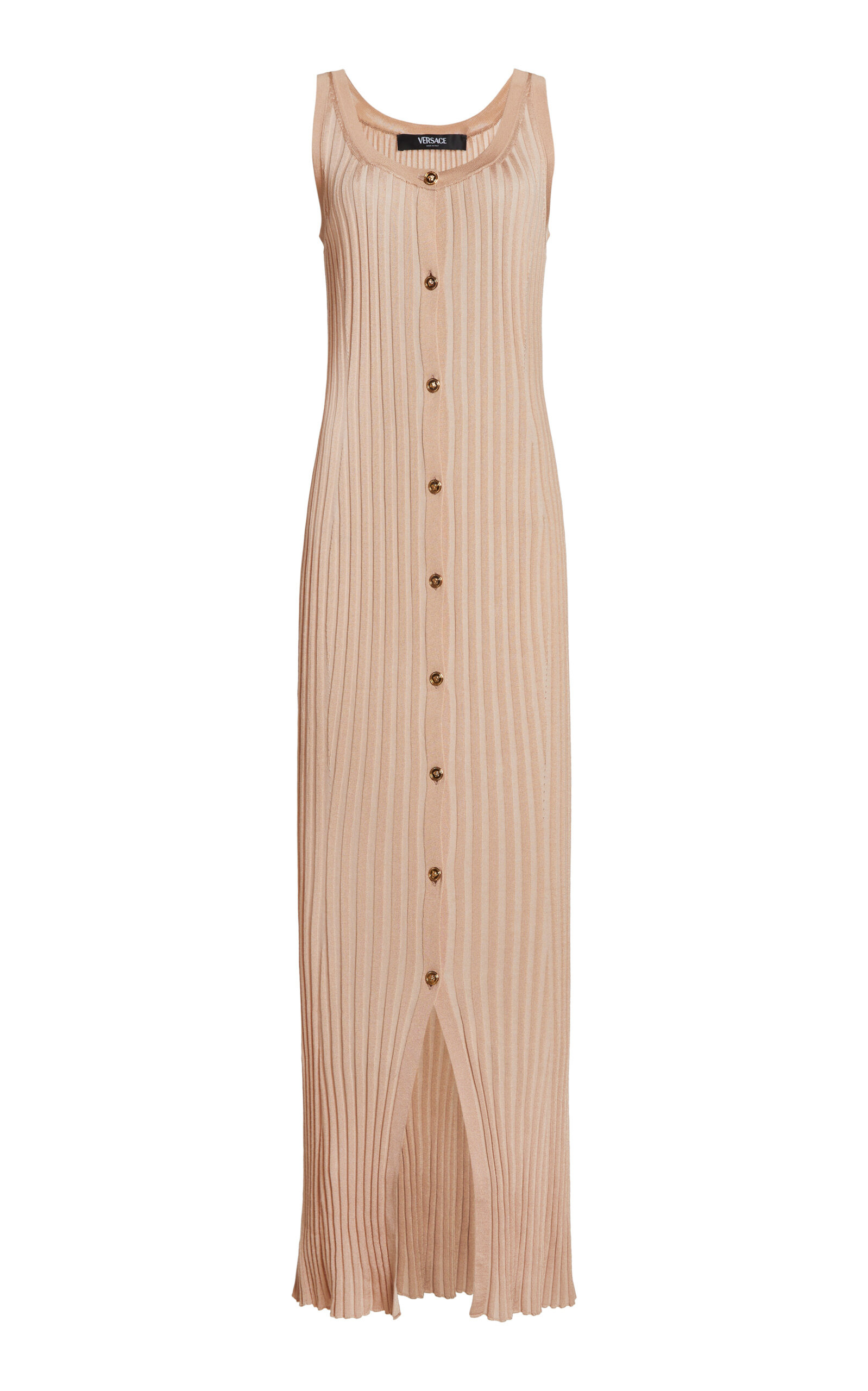 Designs are crafted around the key signatures of the House, from the iconic codes of the Barocco and Medusa ’95 to the use of silhouette, material, and print—immediate signifiers of Versace. Crafted from a cotton-viscose knit blend, this maxi dress flows slender over the body with a bias fit. PRODUCT DETAILS - Pre-Fall '25 - Slip on - Composition: 42% Cotton, 58% Viscose - Designer color: Nude - Dry clean only - Made in Italy SIZE & FIT - Designed for a slim fit