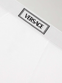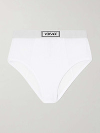 EDITORS'NOTES The high-rise shape of these '90s-inspired Versace briefs feels completely timeless. Cut from soft stretch-cotton for full coverage, they're lightly ribbed for comfort and topped with a logo-jacquard waistband. With the matching bra, it's the perfect set to wear under a T-shirt and jeans. SIZE & FIT - 1 = XS - 2 = S - 3 = M - 4 = L - 5 = XL DETAILS & CARE - White, gray and black stretch-cotton - 93% cotton, 7% elastane