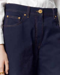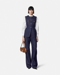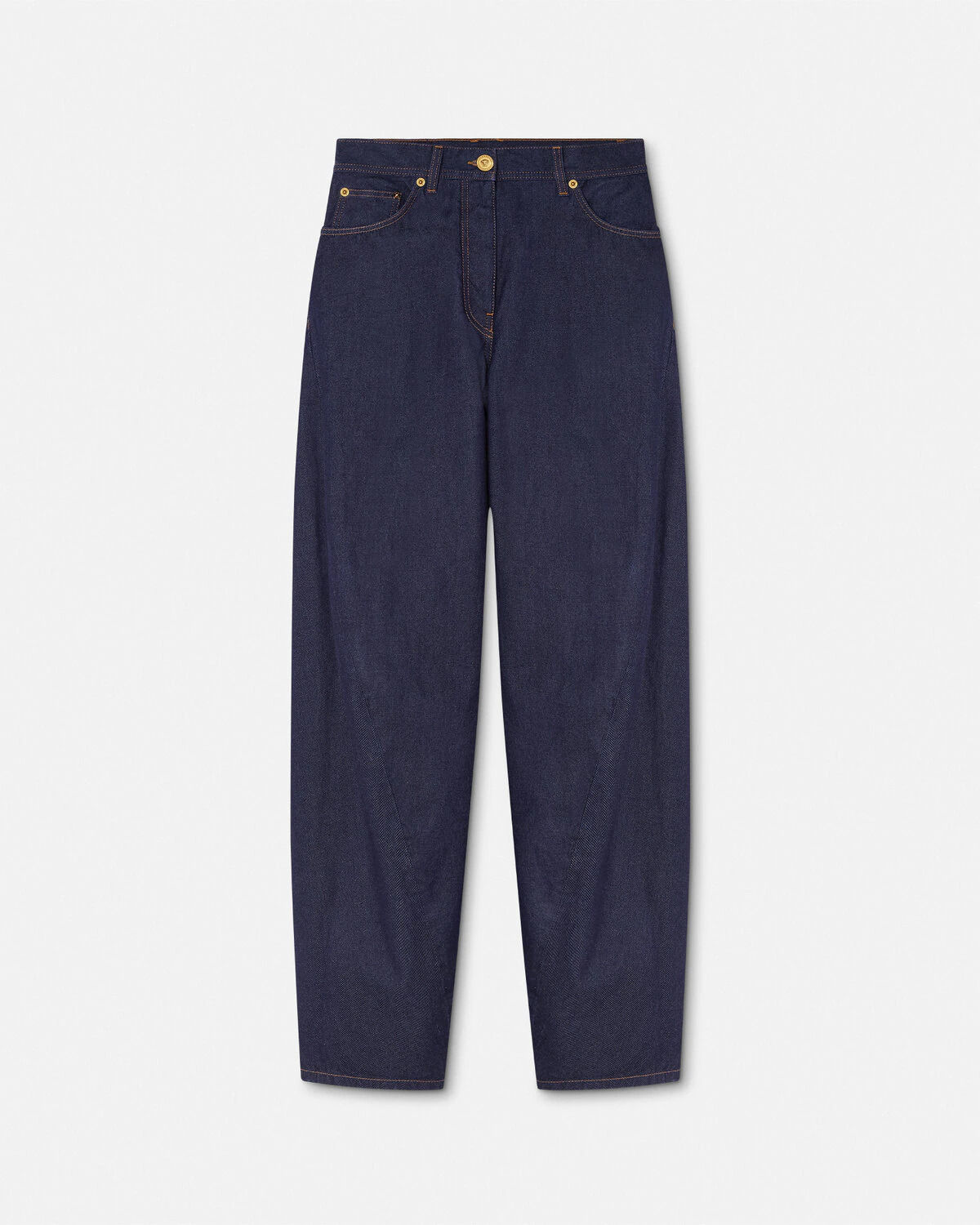 DETAILS Twisted baggy jeans in a medium wash with curved seams featuring an accent Medusa button and a fivepocket design - Medusa hardware - Versace Logo leather patch - Belt loops - Front button and zipper closure - Five-pocket design - Outer composition: 100% Cotton - Trim: 100% Calf leather Item: 1020882-1A15341_1D920 SIZE & FIT - The model is 5'10" / 1.78 m tall and wears size 26 IT