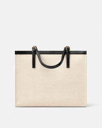 The Riviere large canvas tote bag with leather trims is defined by a central Medusa Cameo leather patch—a 3D rendition which captures the depth of Medusa's eyes and winged details in her hair. The accessory is detailed by an embossed Versace Logo, an interior zipped pocket and a magnetic leather tab closure. - Medusa Cameo leather patch - Versace logo embossing - Adjustable top handles - 1 interior zipped pocket - Interior protector strap - Metal feet - Outer composition: 59% Linen, 41% Cotton - Lining: 59% Linen, 41% Cotton - Trim: 100% Calf leather Size & Fit - L15.6 x W6.3 x H18.7" / L39.5 x W16 x H47.5 cm - Handle drop: L6.5" / L16.5 cm Item: 1024321-1A17864_DTU_UNICA_2K00J__