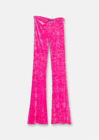 In a soft textured velvet, these flared pants feature a padded, rolled detail at the waist, accented by a Greca pin hardware. Worn with the matching top, the style creates a Very Versace sports-inspired ensemble. DETAILS & CARE - Greca pin hardware - Concealed side zip closure - Outer composition: 92% Polyester 8% Elastane - Hand wash gently using mild detergent - Do not bleach - Do not tumble dry - Dry flat - Do not iron - Do not dry clean SIZE & FIT - All sizes fit Italian standards