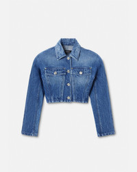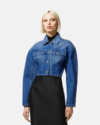 DETAILS This cropped denim jacket features padded, rounded couture shoulders with signature Medusa buttons. - Medusa hardware - Long sleeves - Pointed collar - Front flap pockets - Outer composition: 100% Cotton - Lining: 65% Polyester, 35% Cotton Item: 1012543-1A07079_1D030 SIZE & FIT - The model is 5'8" m tall and wears size 38 IT