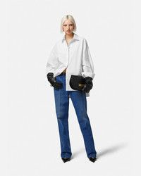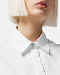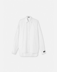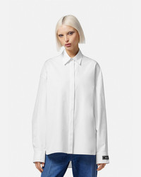 DETAILS A cotton poplin button-down shirt in an oversized fit with dropped rounded shoulders and a tailoring Versace label at the sleeve. - Medusa hardware - Tailoring label - Long sleeves - Pointed collar - Concealed button closure - Outer composition: 100% Cotton Item: 1012533-1A01816_1W000 SIZE & FIT - The model is 5'8" m tall and wears size 38 IT