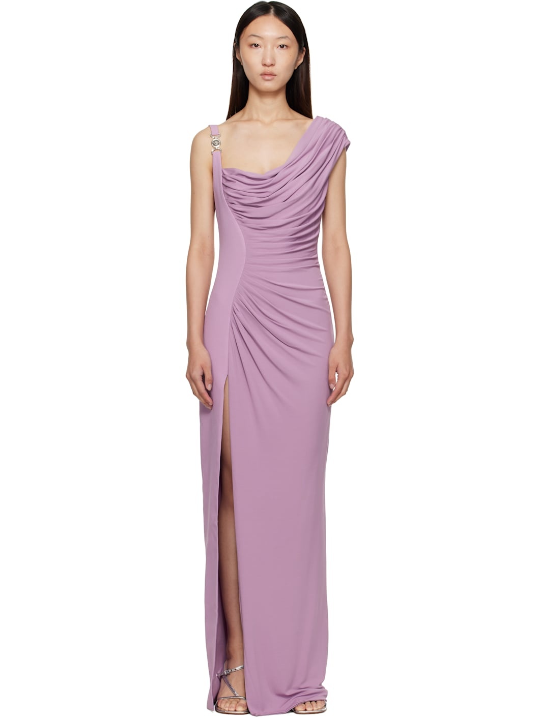 Stretch viscose crepe jersey maxi dress. · Asymmetrical cowl neck · Ruching at front and back · Slit at front hem · Concealed zip closure at side seam · Medusa hardware at fixed shoulder strap · Full crepe jersey lining Supplier color: Purple Body 1: 95% viscose, 5% elastane. Body 2: 74% acetate, 26% viscose. Lining 1: 95% viscose, 5% elastane. Lining 2: 75% acetate, 25% silk. Made in Italy 251404F055005