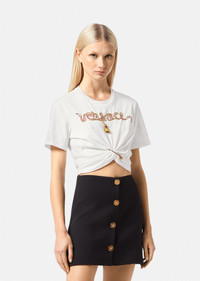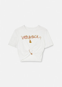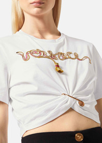 Drawing on the visual codes of 1970s punk style, this short-sleeved T-shirt is gathered at the hemline by the Safety Pin hardware for a slightly cropped silhouette. Made from cotton, the brand logo features across the chest with a tasselled chain lettering. DETAILS & CARE - Safety Pin - Chain and tassel detailing - Short sleeves - Crewneck - Outer fabric: 100% Cotton - Cool iron on reverse with damp cloth on top - Do not dry clean - Do not bleach - Do not tumble dry - Wash in cold water - Wash separately and inside out SIZE & FIT - All sizes fit Italian standards