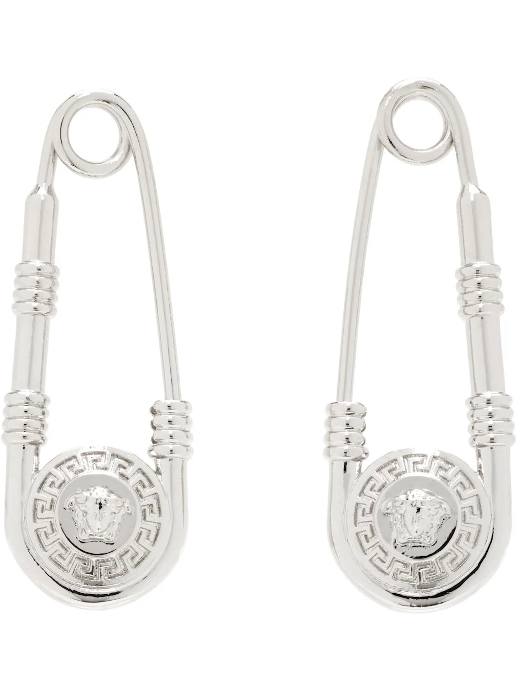 Pain of drop earrings in silver-tone brass. · Signature Medusa and Greek key pattern at drop · Safety-pin fastening · H1.25" x W0.5" Supplier color: Palladium Brass. Made in Italy 261404F022007