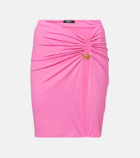 Versace infuses everyday essentials with its signature bold glamour. This pink miniskirt is crafted from soft jersey and features artful gathering throughout, finished with the house’s iconic gold-tone Safety Pin — a nod to the label’s daring heritage. Product Details - Material: 90% polyamide, 10% elastane - Care instructions: hand wash - Made in Italy - Designer color name: Dragon Fruit - Item color: pink - Includes: dust bag - Item number: P01069643 Size & Fit - True to size - Stretchy fabric - Sits low on the hips - The model seen in the picture is 178cm-5'10" and wearing a size IT 40