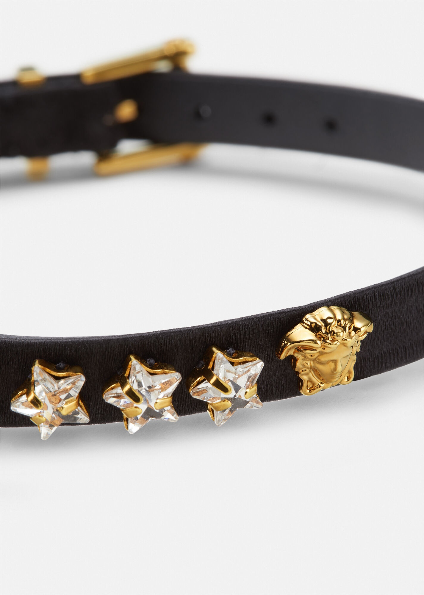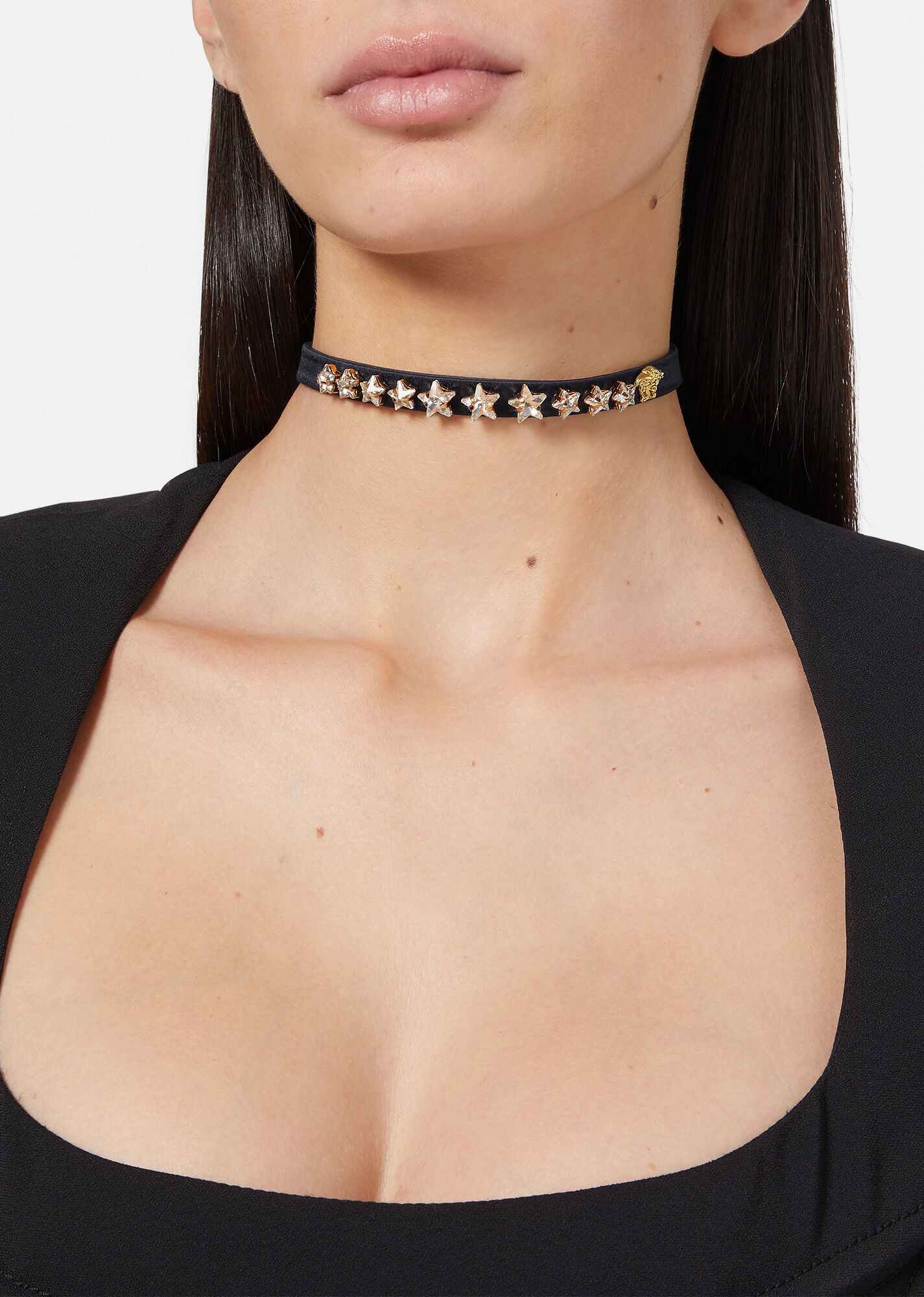 This satin choker is enriched with star-shaped crystals and a mini Medusa stud. It features an adjustable buckle closure with V-shaped hardware at the back. All Versace jewellery products are lead and nickel free. All materials are hypoallergenic. DETAILS & CARE - Medusa stud - Star-shaped crystals - V-shaped hardware - Buckle closure - Adjustable length - Outside: 32% Silk, 68% Viscose - Trim: 1% Lambskin, 99% Metal SIZE & FIT - Height: 1,1 cm