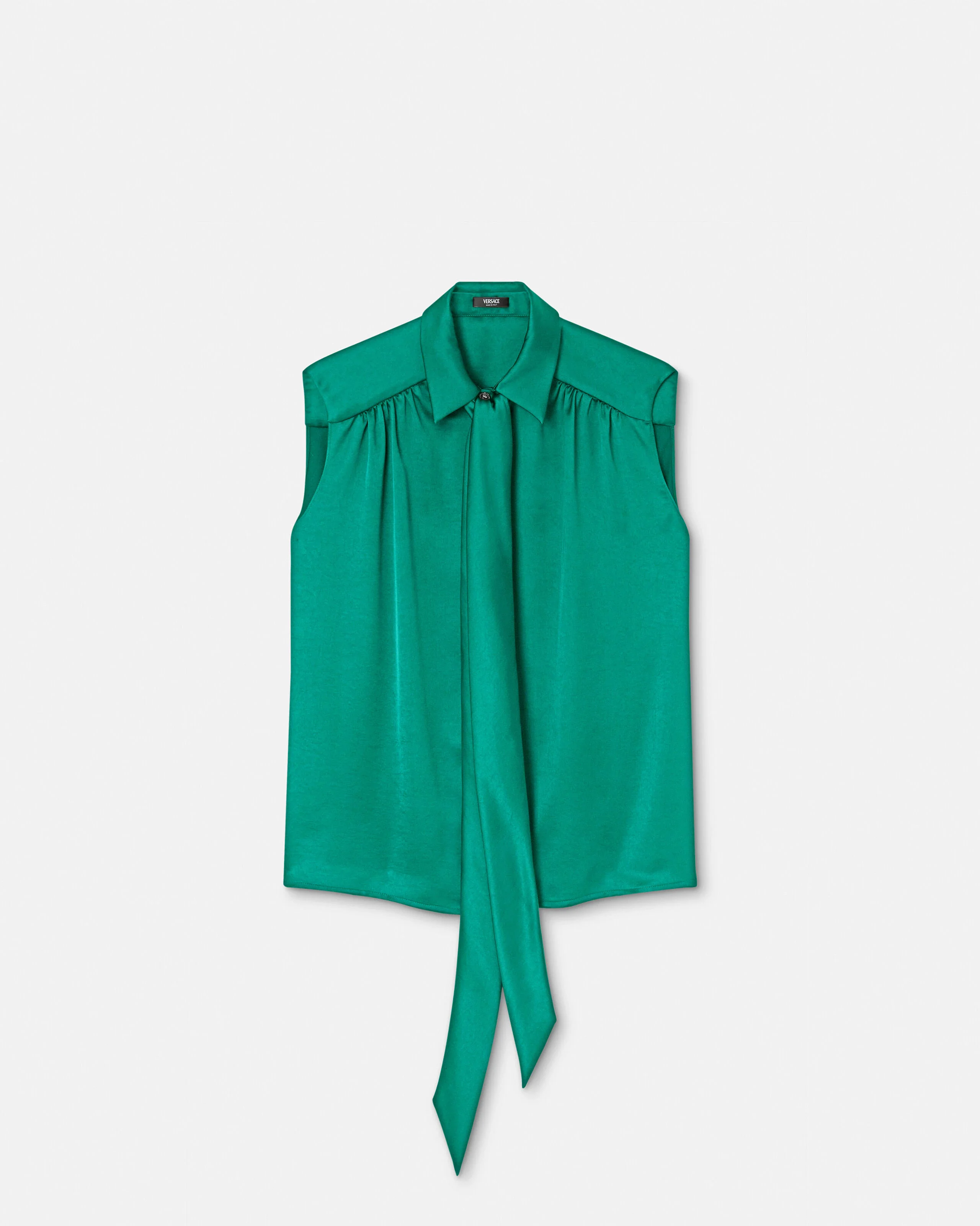 A sleeveless shirt in satin with a lavalliere collar featuring an accent Medusa button at the front closure. - Medusa hardware - Sleeveless - Lavalliere collar - Front button closure - Outer composition: 100% Polyester Size & Fit - The model is 5'10" / 1.79 m tall and wears size 38 IT Item: 1023034-1A12921_1GQ50