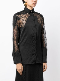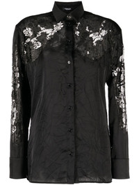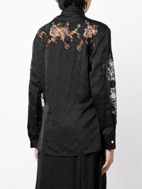 sheer-lace crinkled satin shirt Imagined in black, this satin shirt by Versace is defined by a subtle crinkle effect that brings texture to the silhouette. Cut to a slim fit, it recalls the brand's sophistication with tonal lace panels across the shoulders and sleeves. Highlights - Black - Satin finish - Crinkled finish - Sheer lace panelling - Pointed flat collar - Front button fastening - Long sleeves - Buttoned cuffs - Rear curved hem Made in Italy Composition Polyester 100% SIZE & FIT Model measurements Height 5 ft 10 in(1.77 m) Bust/Chest 31.49 in(80 cm) Hips 35.43 in(90 cm) Waist 25.19 in(64 cm) FittingInformation Designed to be unstructured, offering a loose fit throughout Made from a lightweight non-stretch fabric This piece fits true to size – take your usual size