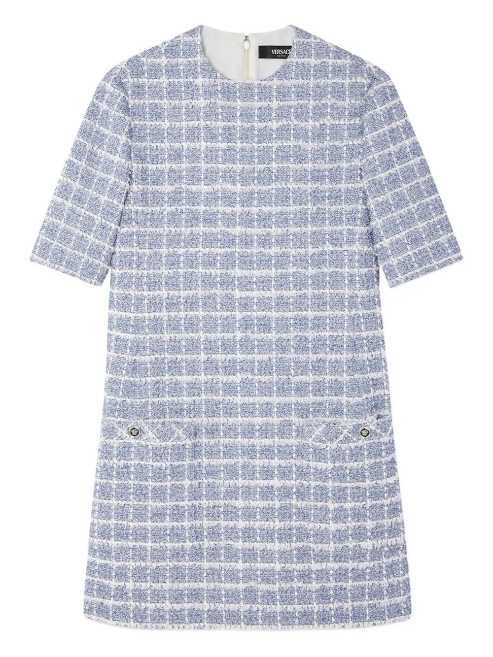 tweed A-line mini dress Highlights - Light blue - Concealed rear zip fastening - Two front patch pockets - Crew neck - Short sleeves - Lurex detailing - Signature medusa head buttons Made in Italy Composition Outer: Cotton 58%, Polyester 29%, Acrylic 10%, Other fibres 2%, Elastane 1% Lining: Acetate 75%, Silk 25%