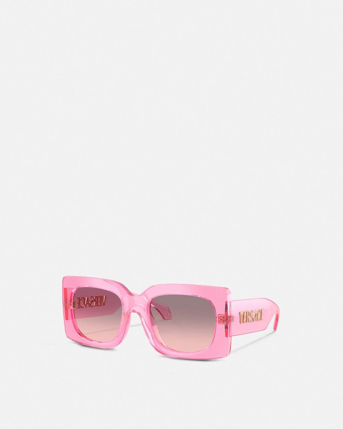 DETAILS These injected squared sunglasses are detailed with a signature Versace Logo on the temples - Versace Logo lettering - Frame color: Transparent pink - Temple color: Transparent pink - Lens color: Rose gradient gray - Frame: Injected - Temple: Injected Item: O4496U-O53705M54_ONUL SIZE & FIT - Lens: W2.1" x H1.7" / W54 x H44.4 mm - Bridge: 0.8" / 21 mm - Temple: 5.5" / 140 mm